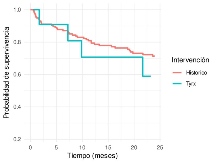 Curvas de supervivencia de pacientes con implante de malla antibiótica (Tyrx, curva azul) y pacientes con manejo conservador (curva naranja).