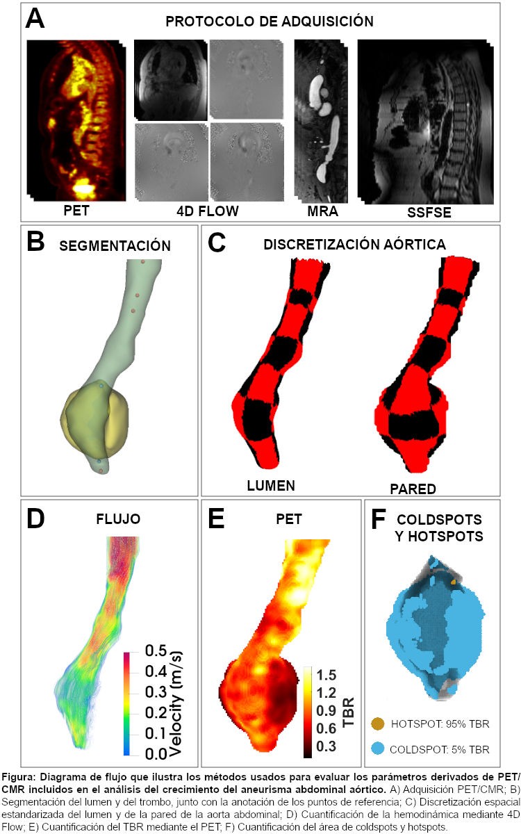 Introducción y objetivos: El diagnóstico temprano y la estratificación del riesgo en los pacientes con aneurisma de aorta abdominal (AAA) es fundamental para que los pacientes puedan beneficiarse de la cirugía electiva. Actualmente, el único marcador de imagen utilizado para evaluar el riesgo es el diámetro máximo del aneurisma. Sin embargo, la presencia de trombo, inflamación o alteraciones hemodinámicas podrían influenciar la progresión del aneurisma. El objetivo del estudio fue investigar correlaciones entre parámetros de flujo, trombo y metabolismo de la glucosa y el crecimiento prospectivo del AAA.