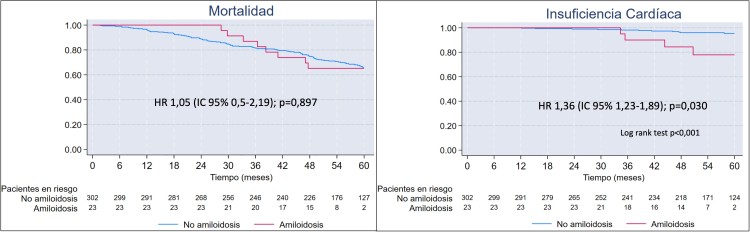 Resultados: Se incluyeron 345 pacientes, de los cuales 23 (6,7%) presentaban AC-TTR. Las características basales de cada grupo se muestran en la tabla. Los pacientes con AC-TTR eran significativamente más mayores (83,9 frente a 81,3; p = 0,039), estaban menos sintomáticos (NYHA III-IV 26 frente a 53%; p = 0,007), y el gradiente máximo transvalvular era menor (68,3 frente a 84,4; p = 0,005), comparado con los pacientes sin AC-TTR. Con un seguimiento medio de 55,9 meses (± 12,2), se evaluaron las hospitalizaciones por insuficiencia cardiaca (IC) y la mortalidad por cualquier causa (Figura). Las hospitalizaciones por IC a los 12 meses no mostraron diferencias significativas entre ambos grupos (8,7 frente a 6,8%; p = 0,489), pero sí fue significativamente mayor al final del seguimiento en los pacientes con AC-TTR (HR 1,36 (IC95% 1,23-1,89); p = 0,030). La mortalidad por cualquier causa fue comparable en ambos grupos, tanto a los 12 meses (0 frente a 6,8%; p = 0,300) como al final del seguimiento (HR 1,05 (IC95% 0,5-2,19); p = 0,897).
