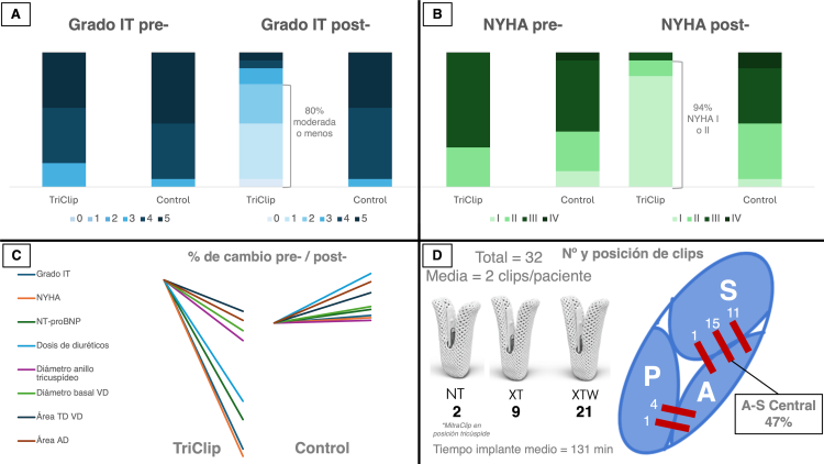 Resultados de la intervención con TriClip. (A) cambio en el grado de IT antes y después de la intervención. (B) cambio en la clase funcional NYHA antes y después de la intervención. (C) porcentaje de cambio en las variables clínicas y ecocardiográficas. (D) número y posición de clips.