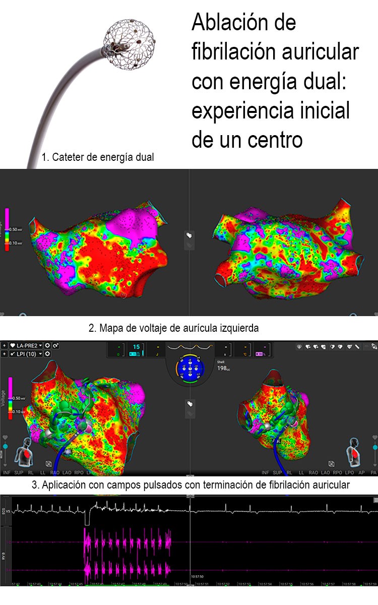 Conclusiones: En esta experiencia inicial, la ablación con catéter de energía dual ha mostrado una alta eficacia aguda, permitiendo procedimientos más rápidos y con menor radiación que la RF convencional. En pacientes en FA, ha mostrado unas altas tasas de paso a flutter/ritmo sinusal durante la ablación. El seguimiento determinará la evolución a largo plazo.