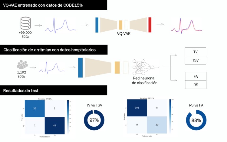 Resultados: El modelo logró una precisión del 97% en la clasificación de TV frente a TSV y del 88% en la diferenciación entre ritmo sinusal (RS) y fibrilación auricular (FA), usando únicamente las codificaciones aprendidas sin supervisión. Estos resultados fueron obtenidos sobre ECG reales hospitalarios, distintos en duración, calidad e incluso tipos de arritmia a los usados en el preentrenamiento, demostrando la enorme capacidad de generalización del VQ-VAE.
