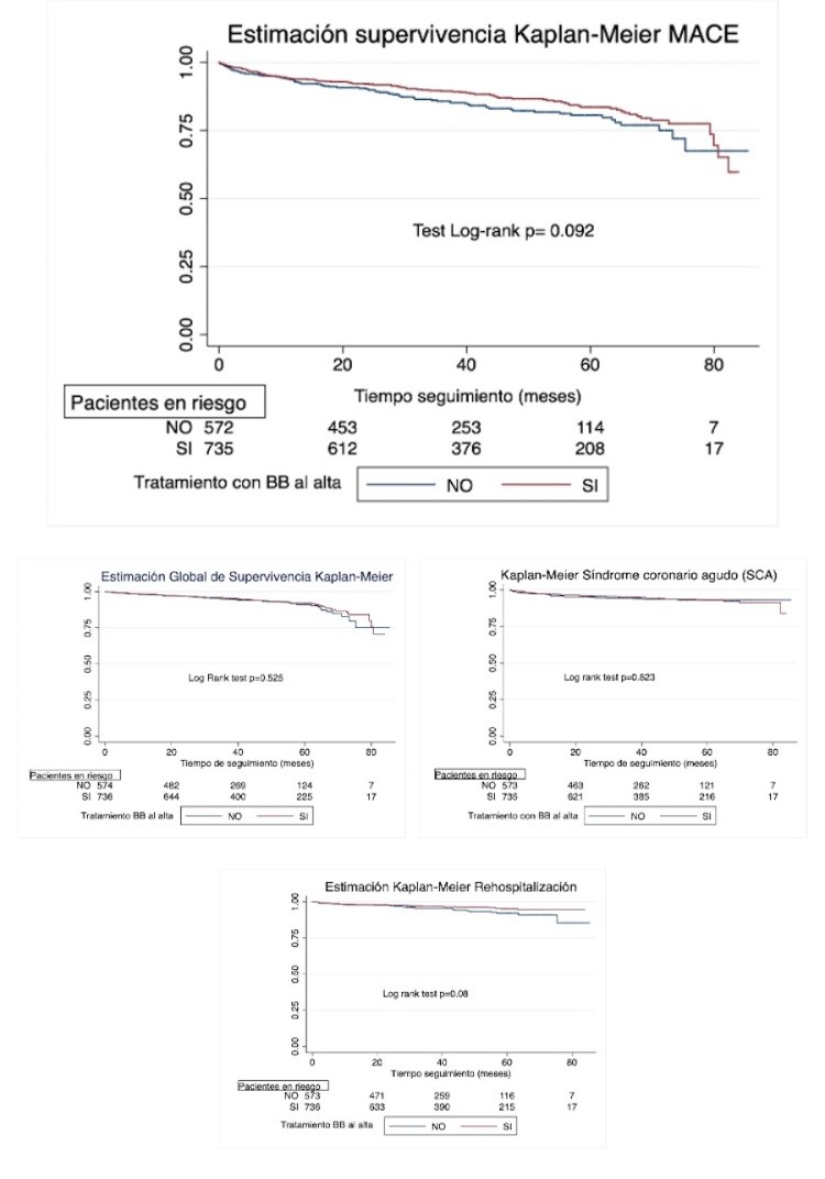 Métodos: Se realizó un estudio observacional retrospectivo a partir de una cohorte de 1.325 pacientes, con un seguimiento acumulado de 56.158,6 meses. Se incluyeron pacientes sin tratamiento previo con BB, FEVI #1 50% y en los que se realizó cateterismo por sospecha de SCASEST. Se analizaron las características demográficas y cardiovasculares de la muestra. Se realizó un análisis de supervivencia, definiendo evento adverso (MACE) como: muerte por cualquier causa, SCA recurrente y/u hospitalización por IC. Se empleó un modelo de regresión de Cox para evaluar el efecto de los bloqueadores beta sobre la incidencia del endpoint combinado y, adicionalmente, para cada uno de sus componentes individuales, utilizando la prueba de log rank para la comparación de curvas de supervivencia. Se realizó un análisis univariante mediante regresión de Cox para identificar variables con potencial asociación a MACE (p < 0,10). Las variables seleccionadas fueron incluidas en modelos multivariables anidados, comparados mediante el test de razón de verosimilitudes. El modelo final fue definido como el más parsimonioso sin pérdida significativa de ajuste.