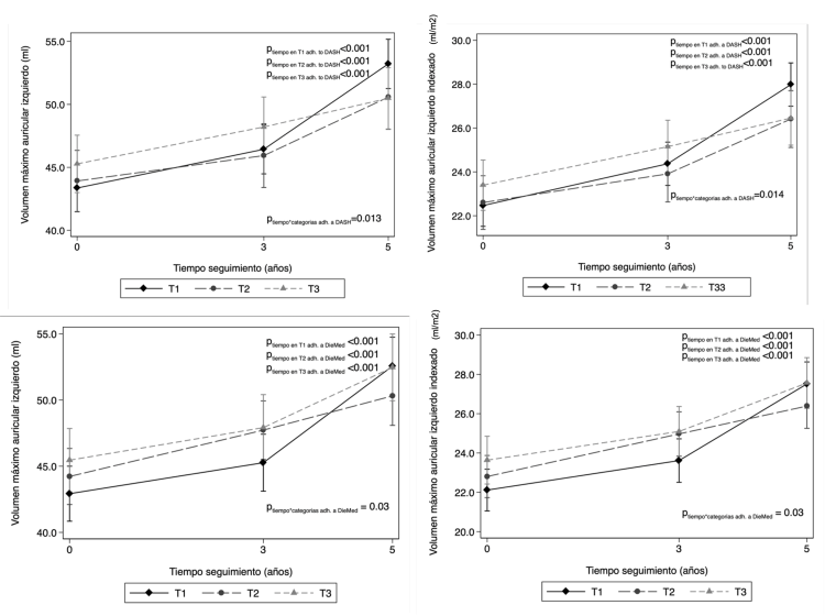 Volumen de aurícula izquierda según adhesión a DieMed y dieta DASH a lo largo del seguimiento.