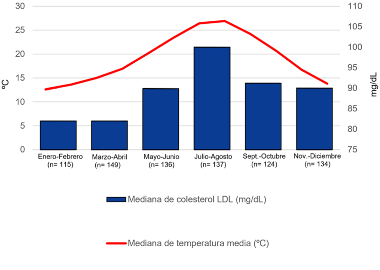 Resultados: Se incluyeron 795 pacientes (edad: 66 ± 12 años, 22,4% mujeres). Los concebidos en temporada cálida presentaron valores más elevados de colesterol total (166 [131,75-196] frente a 153 [126-185] mg/dl; p = 0,012), colesterol no-HDL (120 [93-154] frente a 113,5 [59-35-113,7] mg/dl; p = 0,023) y colesterol LDL (93,7 [68,7-125] frente a 86,1 [59,35-113,7] mg/dl, p = 0,003), pero sin diferencias significativas en índice de masa corporal (28,2 ± 4,2 frente a 28,9 ± 5,0; p = 0,057), triglicéridos (120 [89-172,25] frente a 127,5 [96-168] mg/dl, p = 0,392), colesterol HDL (39 [33-48] frente a 38 [33-46,25] mg/dl, p = 0,362) ni lipoproteína (a) (58,1 [24,9-148,2] frente a 58,9 [24-132,2] mg/dl, p = 0,618). Una temperatura más cálida en la fecha de concepción fue predictor independiente de cifras más altas de colesterol total (OR: 0,75 (0,09-1,42); p = 0,026), no-HDL (OR: 0,69 (0,44-1,33); p = 0,036) y LDL (OR: 0,58 (0,15-1,14); p = 0,044; Tabla).