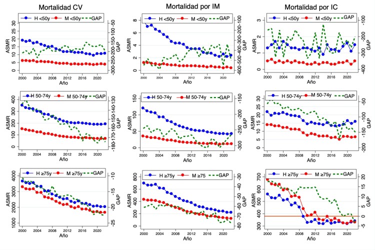 Conclusiones: Existe una evidente brecha de género en la mortalidad CV, IM e IC que siguió tendencias diferenciadas en las dos últimas décadas en España. La mayor reducción de la brecha de género se observó en la mortalidad por IC por la tendencia de las personas #1 75 años.