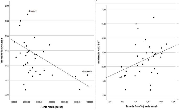 Métodos: Estudio ecológico retrospectivo. Periodo de estudio: junio 2013-diciembre 2018. Población: municipios mayores de 15.000 habitantes de la CAM, excluida la capital. Muestra: IAMCEST registrados en la base de datos de Código Infarto Madrid. Variables Se analiza la correlación de la incidencia de IAMCEST (I-IAMCEST) con indicadores municipales de renta e inversión pública obtenidos de bases de datos de la CAM, mediante regresión lineal simple y multivariada.