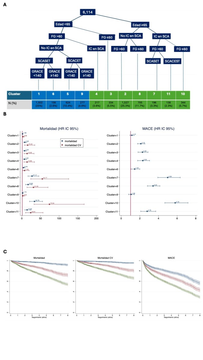 Resultados: Incluimos 8.252 pacientes, con edad media de 65,1 (13,2) años, 25,9% mujeres, IMC medio 28,4 (16,5) kg/m2 y 37,2% tras un SCA con elevación del segmento ST (IAMCEST). Los pacientes elegibles para tratamiento con semaglutida representaron el 74,1% (n = 6,114), la mayoría de ellos debido en un 89% a un (IMC) > 27 kg/m2 y 11% por diabetes. El seguimiento medio fue de 54,7 (32,6) meses. El árbol de decisión (figura A) proporcionó 11 clústeres basados en la edad, la tasa de filtración glomerular (FG), la insuficiencia cardiaca (IC) en el SCA, la puntuación GRACE y la presentación como IAMCEST. El clúster 5 presentó las tasas de mortalidad más bajas y se consideró la referencia (Figura B). Se generó un grupo de alto riesgo de pacientes elegibles con los clústeres 2, 3, 4, 7, 8, 10 y 11 que representaban y clasificaban la cohorte en 3 grupos: no elegibles (33,0%; n = 2.960), elegibles de bajo riesgo (23,6%; n = 2.126) y elegibles de alto riesgo (43,4%; n = 3,894). Las curvas de Kaplan Meier mostraron tasas de mortalidad estadísticamente diferentes (log rank p < 0,01) entre estos 3 grupos (Figura C). El análisis multivariante, ajustados por edad, sexo, revascularización y tratamientos médicos, mostraron que los pacientes elegibles de alto riesgo tenían mayor riesgo de mortalidad por todas las causas (HR: 1,9; IC95%: 1,5-2,4; p < 0,01), mortalidad CV (HR: 2,0; IC95%: 1,5-2,7; p < 0,01) y MACE (HR: 1,2 IC95% 1,1-1,3).