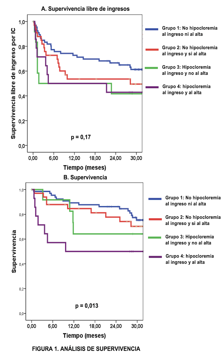 Métodos: Estudio retrospectivo de cohorte de pacientes hospitalizados por IC aguda durante el primer trimestre de 2024, en quienes se determinó niveles séricos de cloro al ingreso y al alta, así como otras variables clínicas, tratamiento e incidencia de eventos (mortalidad, reingresos por IC), los cuales fueron seguidos durante 1 año. Se identificaron 4 grupos: grupo 1 incluye individuos con normocloremia al ingreso y al alta; grupo 2 normocloremia al ingreso e HC al alta; grupo 3 HC al ingreso con normocloremia al alta; y grupo 4 HC al ingreso y al alta. Se analizó la dinámica del cloro y el impacto en la supervivencia en el seguimiento.