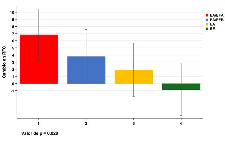 Resultados: Se incluyeron 80 participantes (75,1 ± 7,2 años), cuya RFC media fue de 17,99 ± 9,56 lpm, y el 31,3% de los participantes presentaban una RFC anormal (#2 12 lpm). Tras 12 semanas de intervención, la RFC mejoró significativamente en el grupo EA/EFA (Δ +6,86 lpm; IC95%: 3,25 a 10,47; p < 0,001) y en el grupo EA/EFB (Δ +3,81 lpm; IC95%: 0,05 a 7,56; p = 0,047). No se observaron cambios significativos en el grupo EA (Δ +1,92 lpm; IC95%: -1,84 a 5,67; p = 0,313) ni en el grupo RE (Δ -0,85 lpm; IC95%: -4,46 a 2,77; p = 0,642) (Figura). En el seguimiento, la proporción de participantes con RFC #2 12 lpm disminuyó al 21,3%, y el análisis pareado mostró una tendencia no significativa hacia la mejora (p = 0,074).