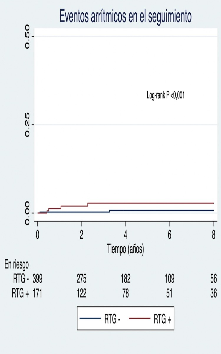 Eventos arrítmicos en el seguimiento en relación a la presencia de RTG.