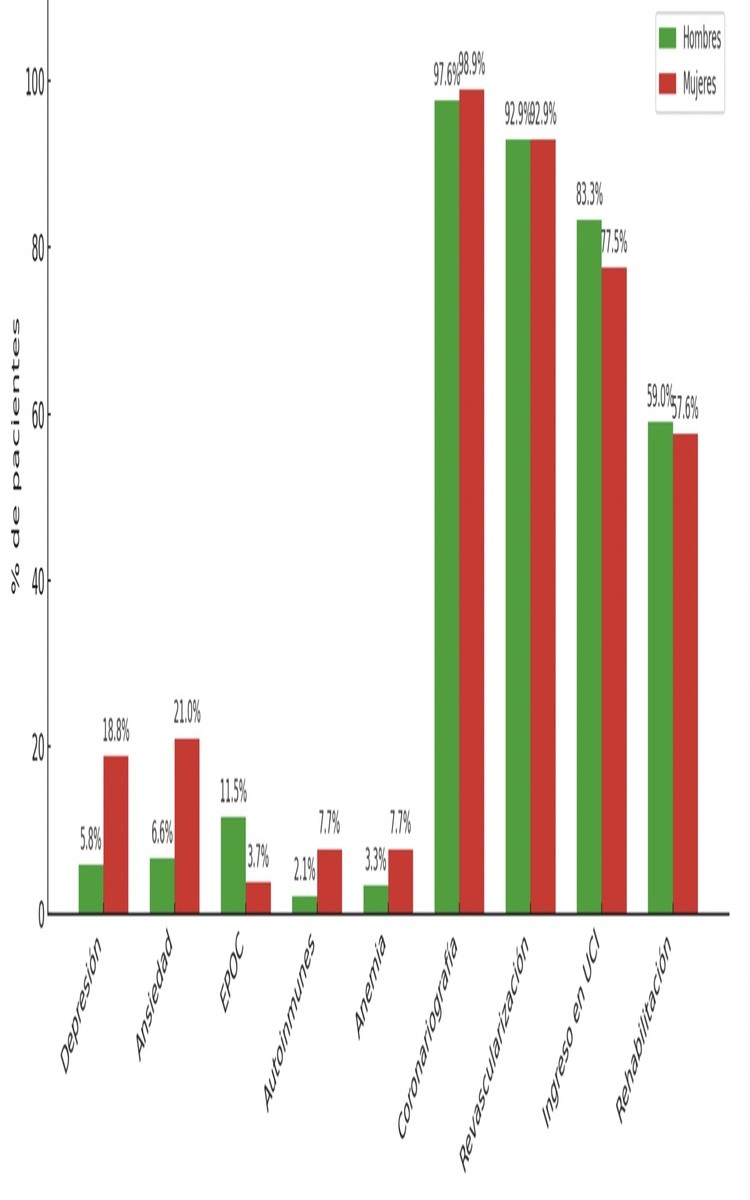 Resultados: Se incluyeron 522 pacientes: 245 hombres (46,9%) y 277 mujeres (53,1%), con edad media similar (65,0 ± 10,8 frente a 64,7 ± 10,2 años). Los hombres presentaron mayor peso (82,4 frente a 72,2 kg; p < 0,001). Las mujeres mostraron mayor prevalencia de depresión (18,7 frente a 5,7%) y ansiedad (20,9 frente a 6,6%), menor consumo de alcohol (5,3 frente a 19,9%), menor prevalencia de enfermedad pulmonar obstructiva crónica (3,7 frente a 11,5%) y mayor de enfermedades autoinmunes (7,7 frente a 2,05%, p = 0,004) y anemia (7,7 frente a 3,28%, p = 0,029). No hubo diferencias en hipertensión, diabetes o dislipemia, aunque las mujeres presentaron mayores niveles de colesterol total, LDL y HDL al ingreso (tabla). La tasa de coronariografía y revascularización fue alta y similar (92,9% ambos sexos). Se observó una tendencia a menor ingreso en unidades coronarias en mujeres (77,4 frente a 83,2%; p = 0,10). El tratamiento farmacológico fue comparable, salvo por mayor uso de sacubitrilo/valsartán en hombres (7,8 frente a 2,6%; p = 0,008). La derivación a rehabilitación fue baja y similar (59,0% hombres frente a 57,6% mujeres).