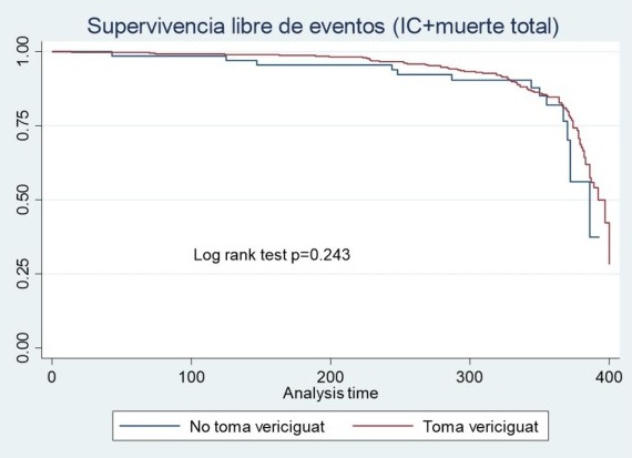 Resultados: Se incluyeron 792 pacientes, con una edad de 71,0 años (DE: 12,3), el 78,5% varones. El 56% tenía antecedente de cardiopatía isquémica. El tratamiento previo al inicio de vericiguat se recoge en la tabla. La media previa de descompensaciones por IC era de 1,9 (DE: 1,4), y la de ingresos por causas CV, incluyendo IC, de 2,7 (DE: 2,2). La mediana de seguimiento fue de 280 días [69,5;362,5]. Al final del seguimiento, el 65,2% de los pacientes continuaba en tratamiento con vericiguat, el 72,6% con la dosis de 10 mg. Al final del seguimiento mejoró la función sistólica y la clase funcional, sin cambios en los péptidos natriuréticos (Tabla). En este grupo, la media de descompensaciones por IC disminuyó de 1,8 (DE: 1,4) a 0,8 (DE: 1,8) (p = 0,001), y los eventos CV de 2,6 (DE: 2,0) a 1,0 (DE: 2,3) (p = 0,001). No hubo cambios en la media de eventos no CV, que pasó de 0,35 (DE: 0,70) a 0,29 (DE: 0,60) (p = 0,817). Durante el seguimiento, fallecieron 29 pacientes con vericiguat (5,6%), el 55,2% por causas CV. No hubo diferencias en la mortalidad total con respecto a los que no tomaban vericiguat (7,4 frente a 5,6%; p = 0,524). De los que tomaban vericiguat, 109 (20,0%) presentaron un evento (muerte total o ingreso por IC), frente a 18 (28,6%) en el grupo que lo había suspendido (p = 0,002). No hubo diferencias en el análisis de supervivencia (Figura).