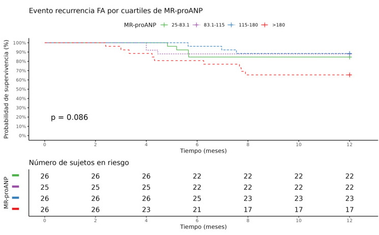 Análisis de supervivencia Kaplan Meier de recurrencia de FA por cuartiles de concentración de MR-proANP.