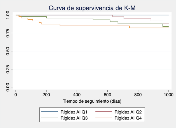 Curva de Kaplan-Meier para mortalidad por cualquier causa en función del índice de rigidez auricular izquierda estratificado por cuartiles.
