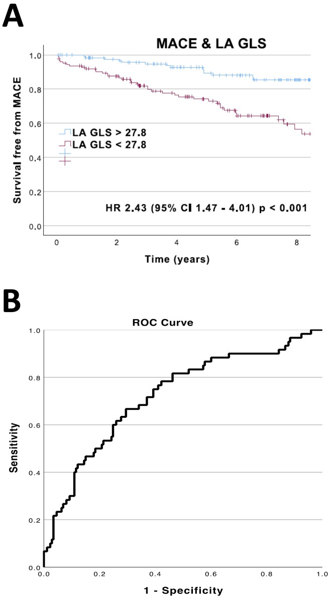 Curva de supervivencia de MACE según LA-GLS y curva ROC para MACE.