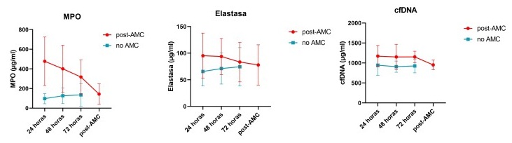 Métodos: Se cuantificaron los niveles de tres componentes de NETs (mieloperoxidasa (MPO), ADN libre en plasma (cfDNA) y elastasa) mediante la técnica ELISA en plasma libre de plaquetas procedente de vía venosa periférica en 46 pacientes con shock cardiogénico con AMC (n = 23) y sin AMC (n = 23) a lo largo de 3 días de evolución desde el comienzo del síndrome. A su vez, se evaluaron los niveles de NET durante el uso de AMC y tras su retirada. La comparación de la evolución en el tiempo de los marcadores se realizó con un modelo mixto de medidas repetidas y múltiples comparaciones. Se utilizó el test de Mann-Whitney para analizar las diferencias entre grupos en los diferentes tiempos de medición.