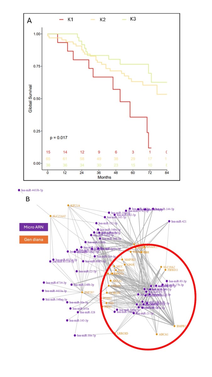 A) Curvas de supervivencia en función de los clústeres establecidos por patrones de expresión de mARNs (K1, K2, K3). B) Genes diana enriquecidos (amarillo) por los microARNs (morado) diferencialmente expresados entre clústeres de supervivencia.