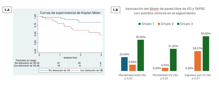 Conclusiones: La disfunción del VD se asocia a peor pronóstico en pacientes con ACTTR, con aumento de la mortalidad, mayor congestión y estadios más avanzados de la enfermedad con disfunción biventricular. El STRAIN de VD aporta un valor añadido en la valoración de los pacientes con ACTTR, con implicaciones en la estratificación de riesgo, incluso en presencia de TAPSE normal.