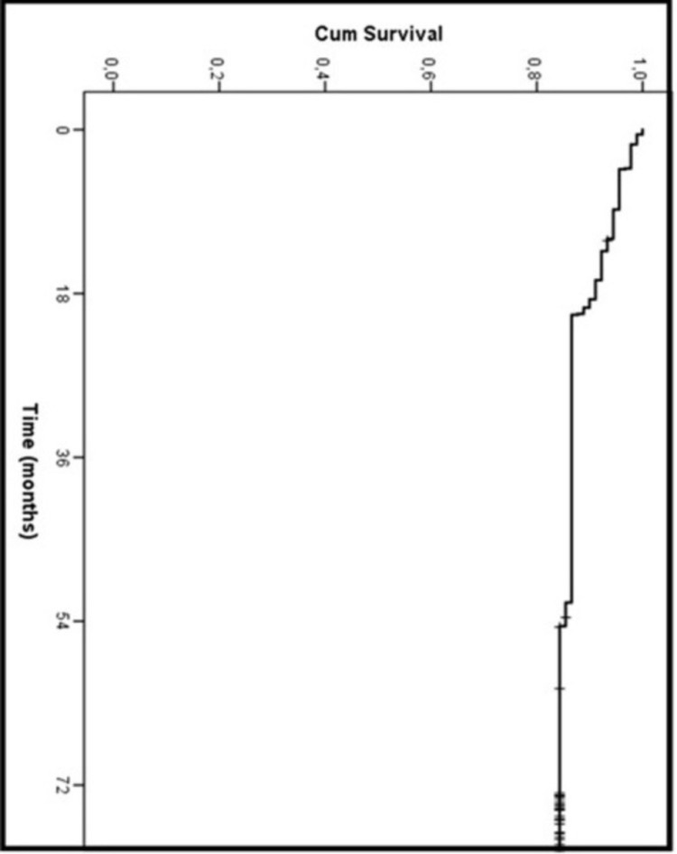 Resultados: Seguimiento medio fue de 6,7 años, durante el cual el 15,6% (14/90) presentó eventos adversos DOCE. Se registraron 6 muertes (6,6%), cinco de causa no cardiovascular y una desconocida. Se observaron dos trombosis del stent (2,2%) y 11 revascularizaciones de la lesión tratada con MgBRS (12,2%). Los eventos DOCE fueron son significativamente más frecuentes en el primer periodo que en el segundo. La muerte, como era de esperar al ser un periodo mucho más largo y siendo los más pacientes más añosos, fue más frecuente en el segundo periodo (Tabla). La concentración de eventos DOCE en el primer periodo puede apreciarse en la curva de supervivencia (Figura).