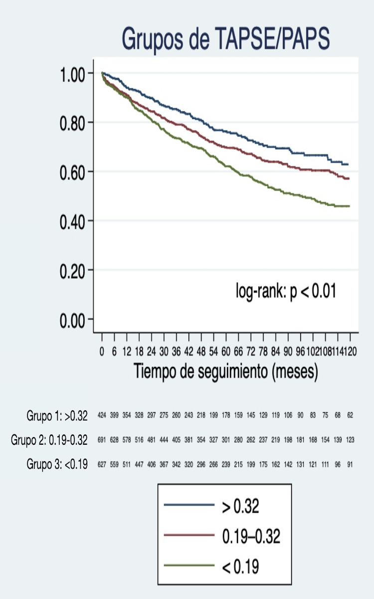 Métodos: Se analizaron pacientes con HAP incluidos en REHAP (2012-2023) con valores disponibles de TAPSE y PAPS al diagnóstico. De 5604 pacientes, se excluyeron 1852 por patologías no HAP y 1984 por datos incompletos, quedando 1768 para análisis. Se clasificaron en tres grupos según las guías de 2022: Grupo 1 (> 0,32 mm/mmHg, n = 429), Grupo 2 (0,19-0,32, n = 702) y Grupo 3 (< 0,19, n = 637). Se compararon características clínicas, hemodinámicas y terapéuticas. El evento primario fue un combinado de fallecimiento o trasplante. La relevancia pronóstica del TAPSE/PAPS se estudió mediante análisis multivariante con regresión de Cox y se confirmó mediante análisis de supervivencia de Kaplan-Meier. Los análisis fueron realizados con Stata 13.0.