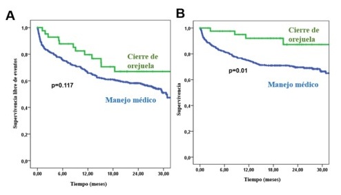Resultados: Se incluyeron 1.403 pacientes, de los cuales 364 presentaron HIC. La mediana de edad fue de 78 años, y el 59,9% eran varones. Solo 44 pacientes (12,1%) fueron tratados con COAI, realizado a una mediana de 5 meses tras el alta. A los 24 meses, los pacientes con COAI presentaron una supervivencia libre del evento combinado numéricamente mejor (67 frente a 58%, p = 0,117) y una supervivencia global significativamente superior (87 frente a 70%, p = 0,01), representados en las figuras A y B. En el análisis multivariante, el COAI se asoció de forma independiente a una reducción del riesgo del evento combinado (HR 0,50 [0,26-0,96], p = 0,03) y mostró una tendencia no significativa a menor mortalidad (HR 0,39 [0,13-1,13], p = 0,08).