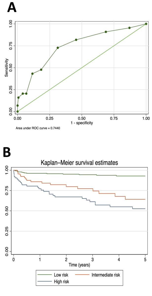 Métodos: Estudio retrospectivo longitudinal. Se reclutaron 589 pacientes con ETVI de 17 centros de Europa y EE. UU.; 398 (67%) fueron asignados a la cohorte de desarrollo y 191 (33%) a la de validación. Se realizó un análisis centralizado de RMC incluyendo parámetros avanzados (strain, fuerzas hemodinámicas). ECAM se definió como un compuesto de insuficiencia cardiaca, arritmias ventriculares, embolismos sistémicos y mortalidad global. Se eligió el modelo predictivo con mayor índice C de Harrell y se convirtió en un score de riesgo. Los pacientes se dividieron según los terciles de puntuación obtenida.