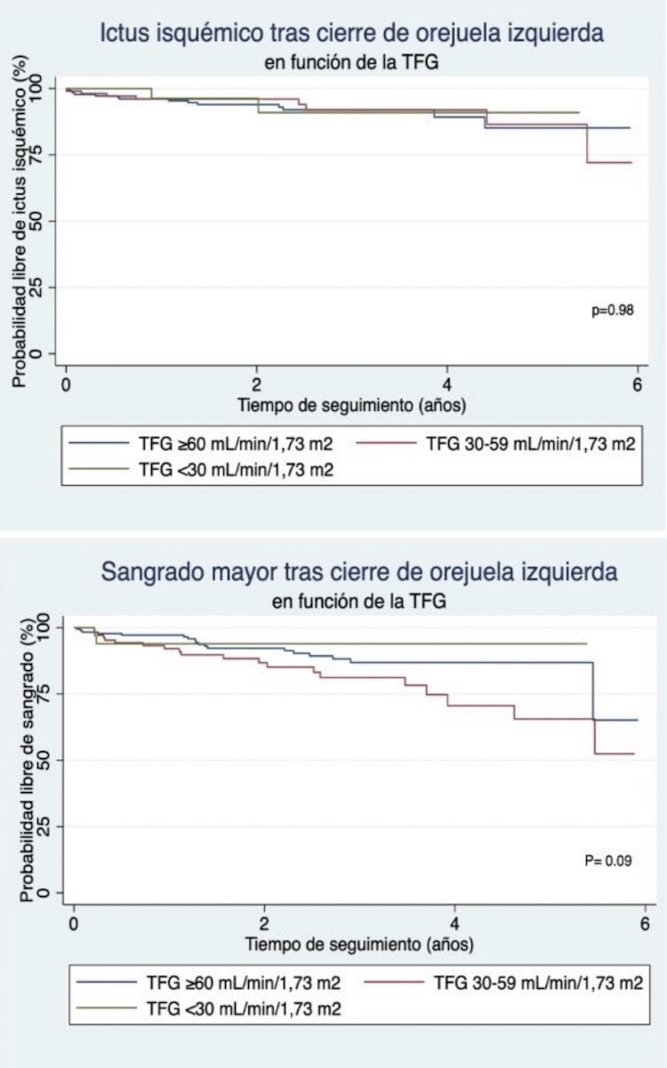 Resultados: La edad media de los pacientes incluidos fue de 75,1 años y aproximadamente la mitad eran mujeres (n = 162; 44,9%). 200 con TFG #1 60 ml/min/1,73 m2, 124 con TFG 30-59 ml/min/1,73 m2 y 37 con TFG < 30 ml/min/1,73 m2. A menor tasa de filtrado glomerular (TFG), mayor comorbilidad, mayor riesgo isquémico evaluado mediante CHA2DS2-VASc y mayor riesgo hemorrágico determinado por HAS-BLED (Tabla). También se observó mayor historia de sangrado previo a menor TFG. No hubo diferencias en complicaciones vasculares posprocedimiento, ni en taponamiento peri-procedimiento. Con un seguimiento medio de 5,3 (DE 1,1 años), tras cierre de OAI, 32 (16%) pacientes con TFG #1 60 ml/min/1,73 m2, 36 (29%) con TFG 30-59 ml/min/1,73 m2 y 17 (46%) con TFG < 30 ml/min/1,73 m2 fallecen; 16 (8,0%) con TFG #1 60 ml/min/1,73 m2, 10 (8,1%) con TFG 30-59 ml/min/1,73 m2 y 2 (5,4%) con TFG < 30 ml/min/1,73 m2 presentan ictus isquémico; y 19 (9,5%) con TFG #1 60 ml/min/1,73 m2, 22 (17,7%) con TFG 30-59 ml/min/1,73 m2 y 3 (8,1%) con TFG < 30 ml/min/1,73 m2 presentan evento de sangrado mayor. No se observan diferencias entre los grupos en incidencia de ictus isquémico (χ2 = 0,03; p = 0,98). En cambio, se observa una tendencia a mayor sangrado en pacientes con ERC (χ2 = 4,54; p = 0,09) (Figura).