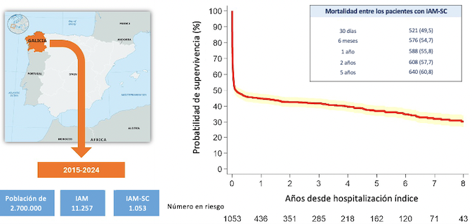 Conclusiones: 1 de cada 10 pacientes con IAMCEST evoluciona a SC (9,35%). Aunque se han producido pequeñas mejores en la mortalidad a corto y largo plazo, las tasas siguen siendo elevadas, particularmente en los primeros 30 días.