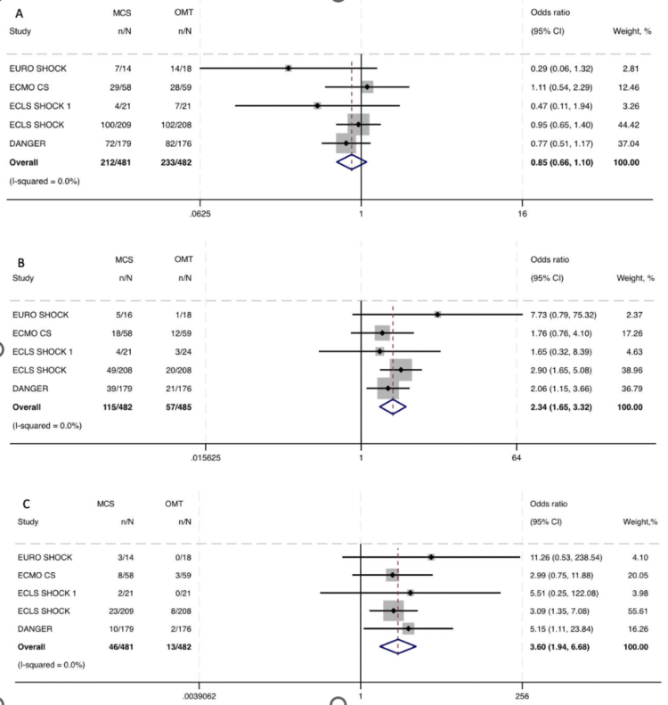 Métodos: Se realizó una búsqueda sistemática en bases de datos hasta julio de 2024. Los criterios de inclusión fueron: a) ensayos clínicos comparando TMO frente a el uso de ACM (ECMO o Impella) en pacientes con shock cardiogénico por SCA; b) disponibilidad de datos. El objetivo principal fue la muerte por cualquier causa a los 30 días. Los resultados secundarios: eventos hemorrágicos a los 30 días, accidente cerebrovascular, sepsis e isquemia periférica. Se calcularon los odds ratio y el intervalo de confianza del 95% mediante el modelo de DerSimonian y Laird; la estimación de la heterogeneidad según Mantel-Haenszel; las pruebas de Q de Cochran e I-cuadrado. El nivel estadístico de significación fue de p < 0,05. Se realizó un análisis de metarregresión de efectos aleatorios.