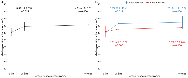 Evolución longitudinal del hematocrito a los 30 y 180 días en la población general (A) y en la estratificada por FEVI (B).