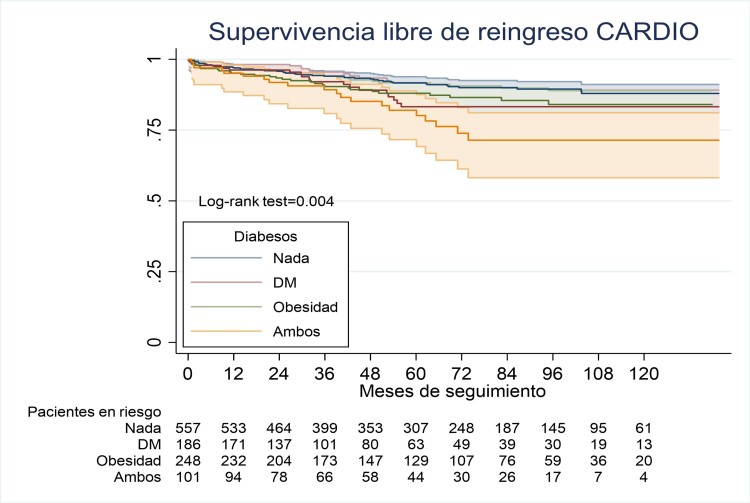 Métodos: Se recogieron retrospectivamente datos de pacientes incluidos en RC en nuestro centro desde marzo de 2013 hasta noviembre de 2024. Los pacientes se clasificaron en 4 grupos: obesidad, diabetes mellitus (DM), diabesidad y ninguno de ellos. Se analizó la supervivencia global (SG) y supervivencia libre de reingreso (SLR) por causa CV mediante el análisis de Kaplan Meier. Se utilizó el análisis multivariante para valorar la disminución de HbA1c y de índice de masa corporal (IMC). Por otro lado, se utilizó el análisis univariante para analizar las diferencias en el uso de aGLP1 e iSGLT2 entre los grupos y su implementación tras el programa de RC.