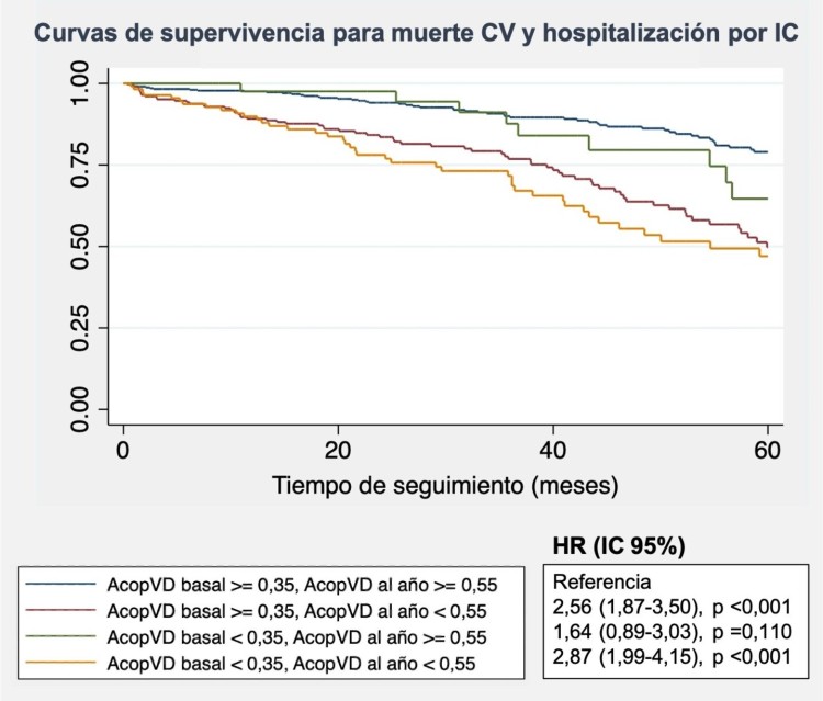 Resultados: Se analizaron 997 pacientes, con una edad media 82,5 (5,8) años, 558 (55,97%) mujeres, y con EuroSCORE II promedio de 5,5 (6). En el ecocardiograma basal, 185 (18,6%) pacientes tenían daño VD establecido. Estos pacientes presentaban peor función ventricular y auricular izquierda basal, y mayor frecuencia de insuficiencia mitral y tricuspídea concomitante. A pesar de ello, los pacientes con daño VD mostraron mejoras significativas en los parámetros de función biventricular en el seguimiento, aunque sin experimentar cambios significativos en la función auricular ni la prevalencia de otras valvulopatías (Tabla). Al año de seguimiento, un 27,5% de los pacientes con daño VD establecido presentaron remodelado inverso derecho hasta alcanzar un AcopVD #1 0,55, mientras que este ocurrió en el 64,4% de aquellos con AcopVD basal #1 0,35; p < 0,001. El remodelado inverso VD al año de seguimiento se asoció de forma significativa con una menor incidencia de muerte cardiovascular (CV) y hospitalización por insuficiencia cardiaca (IC) en ambos grupos de pacientes, independientemente del daño VD basal (Figura).