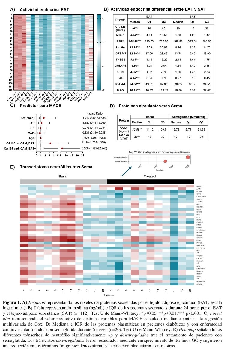 Resultados: De las proteínas cuantificadas en el EAT, había mayor representación de aquellas relacionadas con metabolismo y adiposidad (RBP4, ADIPOQ y FABP4), inflamación endotelial (ICAM-1) y actividad de los neutrófilos (MPO). Las proteínas diferenciales del EAT con respecto al SAT fueron las epiteliales (CA-125 y MSLN), relacionadas con el metabolismo (leptina, IGFBP7 y RBP4), matriz extracelular (THBS2, FAP, OPN y COL4A1), inflamación endotelial (ICAM-1) y actividad de neutrófilos (MPO). La actividad endocrina del EAT relacionada con CA-125 e ICAM-1 fue predictora para MACE. Los pacientes tratados con semaglutida mostraron reducción en los niveles plasmáticos de CA-125 y CCL-5, asociados con una regulación del perfil transcriptómico de neutrófilos relacionada con la migración de leucocitos y activación plaquetaria.