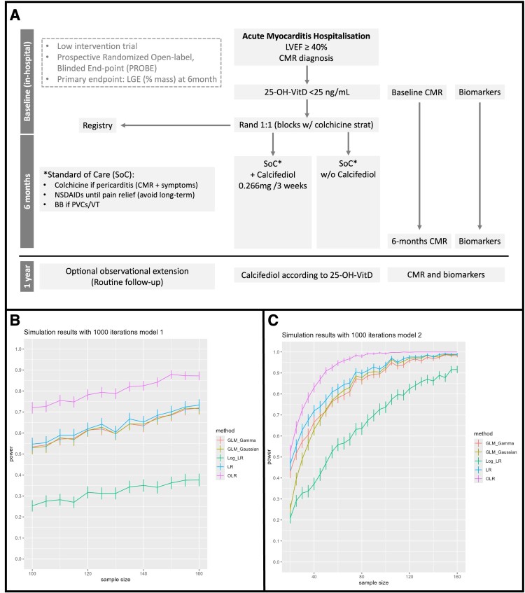 Métodos: ECA independiente y multicéntrico, que evaluará el efecto del tratamiento con calcifediol sobre la fibrosis miocárdica en pacientes con MANC. Pacientes ingresados por MANC y niveles bajos de 25OHD serán aleatorizados 1:1 a recibir o no calcifediol añadido al tratamiento estándar. Al tratarse de un medicamento aprobado para la hipovitaminosis D, el estudio podría considerarse de baja intervención. Dado que los eventos clínicos son potencialmente graves, pero infrecuentes y a largo plazo, se ha elegido un objetivo principal surrogado: la fibrosis miocárdica cuantificada mediante resonancia magnética con realce tardío de gadolinio (LGE, % de masa) a los 6 meses (Figura 1A). Dada la distribución asimétrica del LGE y la falta de ECA previos con este objetivo, realizamos un estudio de simulación para estimar el tamaño muestral necesario en función de diferentes tamaños del efecto y seleccionar el modelo estadístico más eficiente. Estudio aprobado por la Agencia de Investigación de la Sociedad Española de Cardiología.