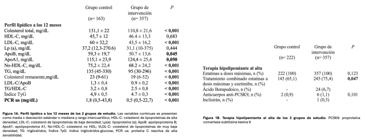 Resultados: No hubo diferencias en la edad, sexo, niveles lipídicos, factores de riesgo, tipo de SCA (SCASEST y SCACEST) ni características de revascularización entre ambos grupos. A los 12 meses tras el alta, no existían determinaciones analíticas de LDL-C en el 26,6% de lo pacientes del grupo control, por un 0% en el grupo de intervención (p < 0,001). El LDL-C a los 12 meses fue significativamente más alto en el grupo control (60 ± 32,2 frente a 43,5 ± 16,2 mg/dl, p < 0,001), y el% de pacientes con LDL-C < 55 mg/dl fue del 42,1% frente al 85% en el grupo de intervención (p < 0,001). La incidencia de MACE a los 12 meses fue significativamente mayor en el grupo control (21,6 frente a 10,9%, p < 0,001).