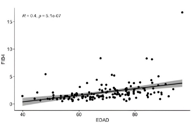 Conclusiones: Los niveles de FIB-4 se asocian significativamente con la edad, siendo más altos en pacientes mayores de 80 años. Estos resultados sugieren que FIB-4 podría ser una herramienta valiosa para la estratificación del riesgo en pacientes mayores con enfermedad cardiovascular, aunque se requieren estudios adicionales para validar estos hallazgos en poblaciones más amplias.