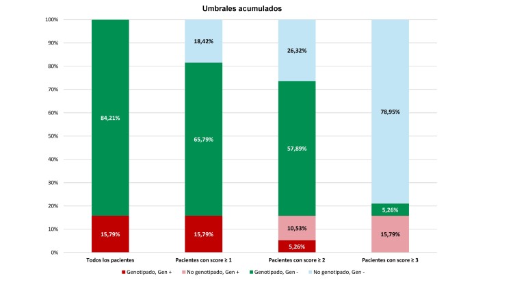 Resultados: Seis pacientes (16%) presentaron un EG +. En el total de la muestra 8 pacientes tenían HF de MCD (21%), 5 tenían bajos voltajes en el ECG (13%), 20 no presentaban BRIHH (53%) y 12 no tenían diagnóstico de HTA (32%). Ningún paciente presentaba miopatía musculoesquelética. Ninguna variable se asoció de forma independiente con un EG +. El SGM en la cohorte fue de 0 puntos en 7 casos (18%), 1 punto en 19 (50%), 2 puntos en 10 (26%) y 3 puntos en 2 pacientes (5%). Entre los pacientes con EG +, 4 tenían 1 punto y 2 sumaban 2 puntos en el SGM. Para evaluar la aplicabilidad del SGM en nuestra práctica clínica, valoramos el impacto potencial de usar los umbrales de puntuación para indicar un EG (Figura).