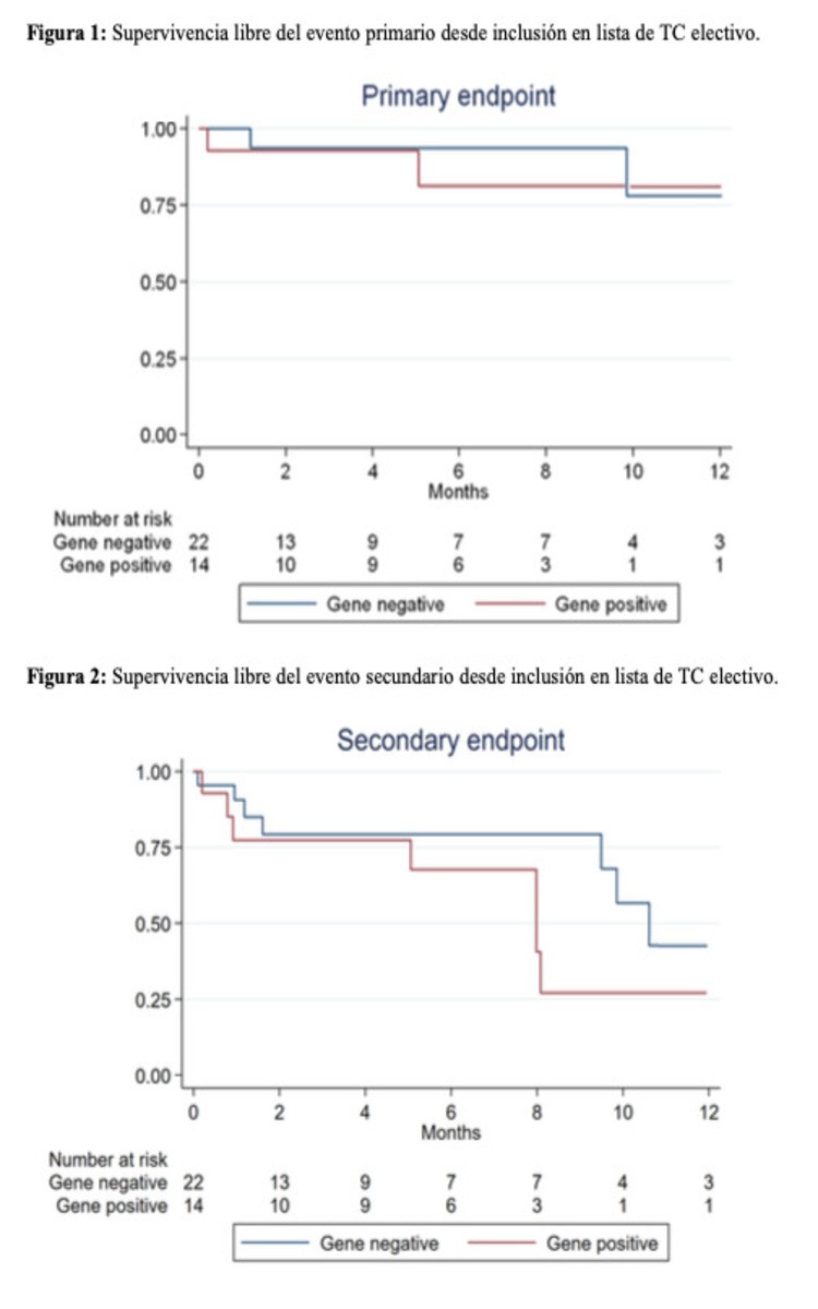 Métodos: Se realizó un análisis retrospectivo unicéntrico de todos los pacientes con diagnóstico de MCDNI (FEVI < 50%) incluidos en lista electiva de TC en el periodo 2010-2024 que contaran con test genético (TG) tipo panel. Se analizó la evolución desde la inclusión hasta el TC o su salida de lista entre el grupo de pacientes con TG positivo y negativo. Se definió un evento primario combinado (muerte, exclusión por complicación médica o cambio a lista de espera urgente o emergente). Se estableció un evento secundario que incluía fallecimiento, exclusión por complicación médica, cambio a lista urgente o emergente, descompensación de insuficiencia cardiaca o arritmia ventricular maligna.