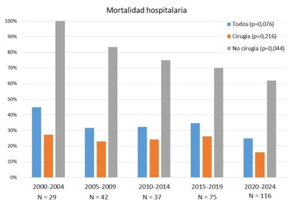 Mortalidad hospitalaria de los pacientes con síndrome aórtico tipo A entre los años 2000 y 2024.
