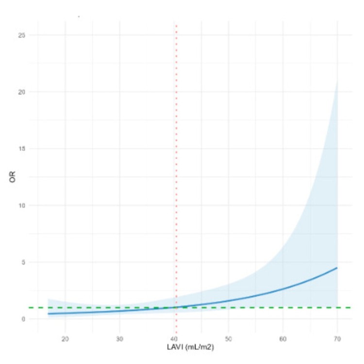 Relación entre el índice de volumen auricular izquierdo por ecocardiografía y la presencia de fibrosis: odds ratio de RTG según LAVI.