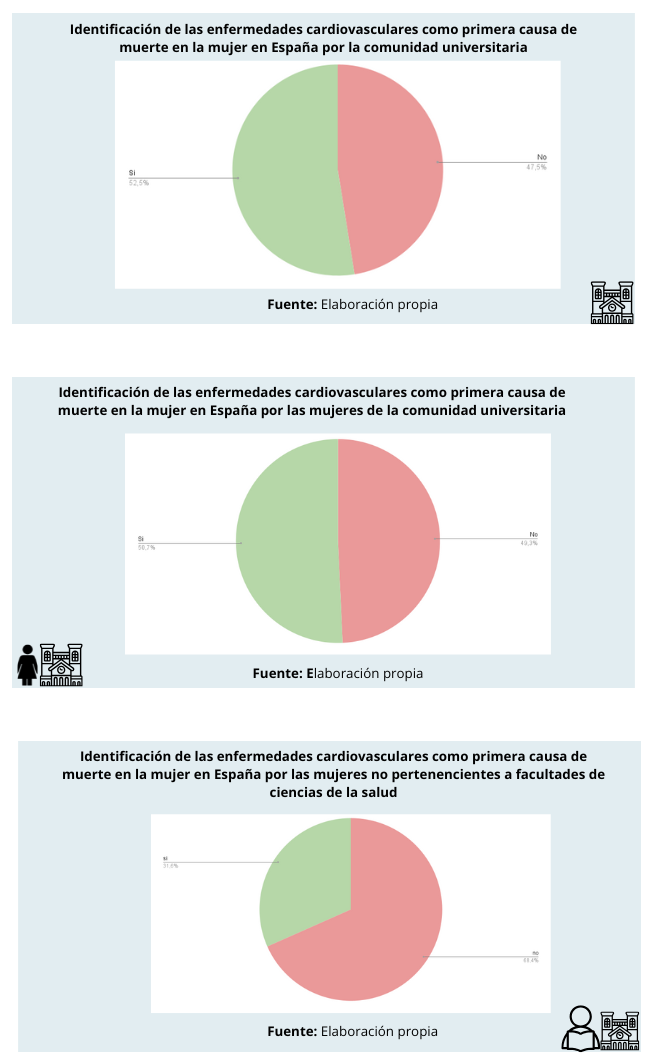Conclusiones: Incluso en la comunidad universitaria persisten lagunas en el conocimiento del riesgo cardiovascular femenino, especialmente en factores sexo-específicos. Solo la mitad de conocen que las ECV son la principal causa de muerte en mujeres y menos de un tercio de la comunidad no vinculada a facultades de Ciencias de la Salud. Estos hallazgos subrayan la necesidad de reforzar la información, la educación sanitaria y la investigación con perspectiva basada en el sexo para una prevención más eficaz en la mujer.
