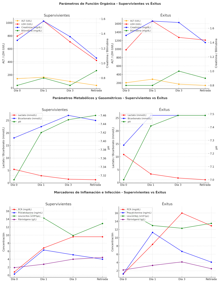 Cinética de biomarcadores en pacientes en ECMO, comparación de supervivientes y éxitos.