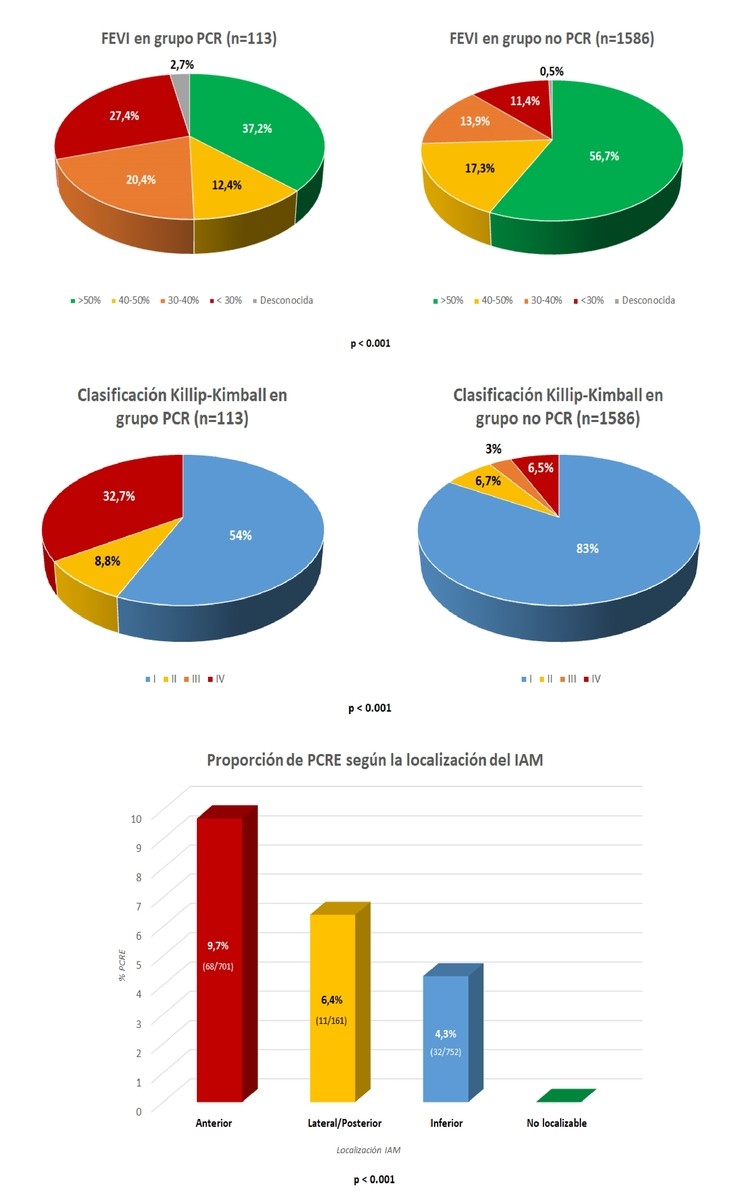 Figura 1. Diferencias en la FEVI en ambos grupos. Figura 2. Diferencias en la clasificación de Killip-Kimball en ambos grupos. Figura 3. Resultados de la proporción de pacientes que presentan PCRE según la localización del IAM.