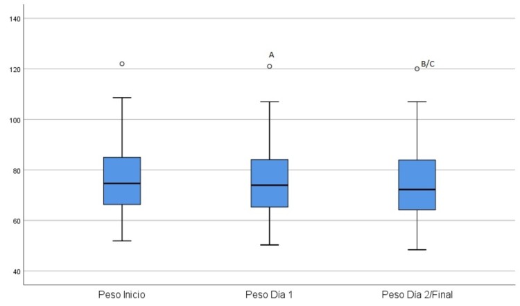 Evolución del peso tras tratamiento diurético intravenoso en pacientes con insuficiencia cardiaca tratados en hospital de día. A p < 0,05 (Inicio frente a Día 1) B p < 0,05 (Día 1 frente a Día 2) C p < 0,05 (Inicio frente a Día 2).