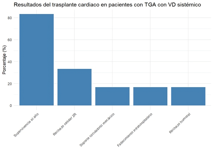 Conclusiones: El trasplante cardiaco en pacientes con TGA es una estrategia terapéutica con resultados favorables a corto y medio plazo. En nuestra serie, la supervivencia al año fue elevada y la incidencia de complicaciones posoperatorias, rechazo y enfermedad vascular del injerto fue comparable a la de otras poblaciones trasplantadas de alta complejidad. Estos hallazgos respaldan el papel del trasplante cardiaco en pacientes con TGA en situación avanzada. Cabe destacar que se trata de un contexto complejo, en pacientes generalmente con cirugías previas, que requieren adecuada selección y manejo multidisciplinario.