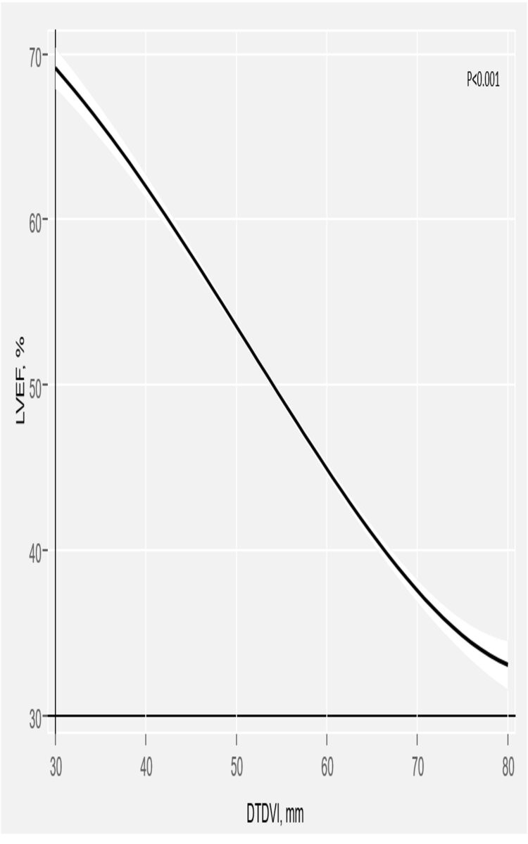 Conclusiones: En pacientes con IC aguda, el DTDVI por ecocardiografía se asoció de forma independiente e inversa con la FEVI, mostrando que un VI pequeño es una de las características clínicas de los pacientes con IC y FEVI supranormal.