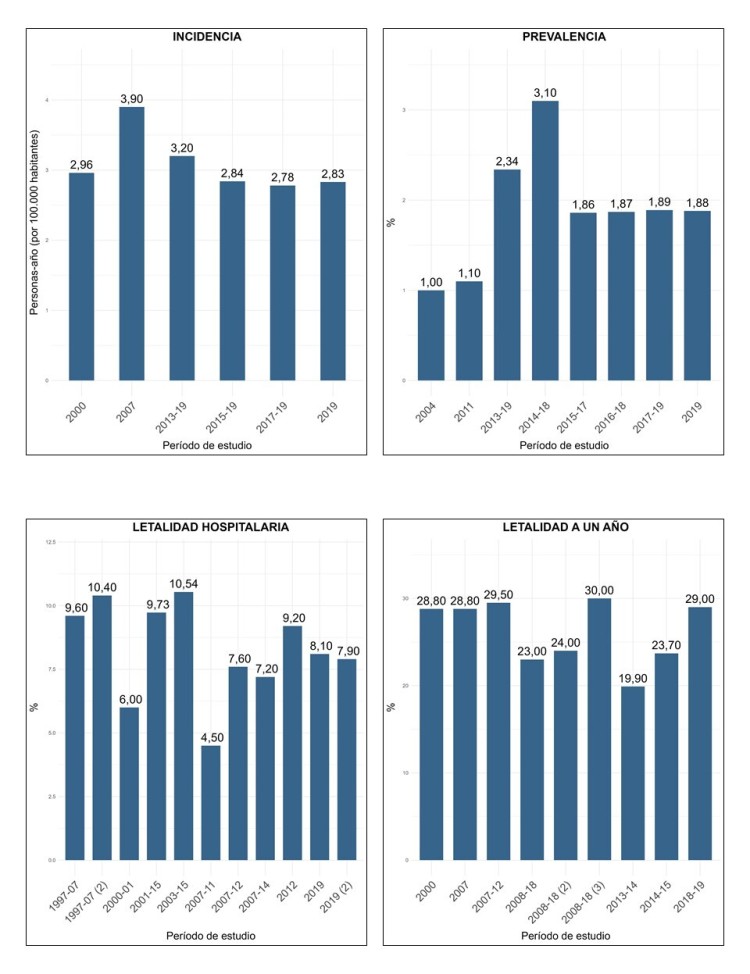 Resultados: Se incluyeron 40 estudios e información del Instituto Nacional de Estadística. La incidencia poblacional oscila entre 2,7-3,2 casos/1.000 personas-año, siendo mayor en atención primaria o urgencias (12,8 y 26,5). La prevalencia en la población general es de 1-2%, cercana a 10% en > 70 años. Algunos estudios refieren una tendencia creciente (no significativa) en los últimos años. Las tasas de mortalidad en la población general son de 27,3/100.000 habitantes en hombres y 28,9 en mujeres, que aumentan con la edad (hasta 721,8 y 958,3 en > 80 años, respectivamente), con un gradiente Sur-Norte. La IC es responsable del 4-8% de la mortalidad total y del 10-19% de la cardiovascular (CV). Aunque la mortalidad por IC ha disminuido en este periodo, esta tendencia se ha estabilizado en población > 84 años. La letalidad hospitalaria media a nivel nacional se encuentra entre 4,5 y 10,5%, con cifras más altas en estudios con criterios diagnósticos menos estrictos y con disparidad regional (8,0% en Madrid frente a 14,4% en Andalucía). La mortalidad a un año es más estable, oscilando entre 19,9-30,0%. La principal causa de muerte es CV, hasta el 50% debida a empeoramiento de la IC.