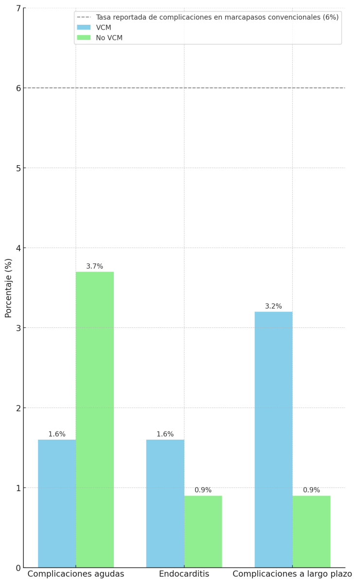Resultados: De los 172 pacientes incluidos el 48% eran varones (83) y la edad media de 77 años. Los pacientes con VCM eran más jóvenes (74 frente a 79 años, p < 0,001) y mayoritariamente mujeres (24% varones), tenían mayor prevalencia de fibrilación auricular (FA) (85,5 frente a 53,2%, p < 0,001), y la indicación más frecuente para el implante fue FA o flutter auricular con bloqueo AV para ambos grupos. La implantación fue exitosa en el 100% del grupo VCM. Las complicaciones agudas fueron infrecuentes y similares entre grupos, 1,6% y 3,7% (p = 0,654) para paciente sin VCM y con VCM respectivamente. El rendimiento eléctrico inicial y en el seguimiento no mostró diferencias significativas. Durante una mediana de seguimiento de 348 días, se produjo un único caso de endocarditis (1,6%) en un paciente con VCM, sin afectación del dispositivo. No se registraron infecciones relacionadas directamente con el MSC en ningún grupo. Estas tasas son inferiores a las comunicadas en marcapasos convencionales, donde la incidencia de infección puede alcanzar el 2-4% y las complicaciones totales el 6-10%, según registros europeos y americanos. La necesidad de resincronización fue baja (1,6%) a pesar de una alta carga de estimulación.