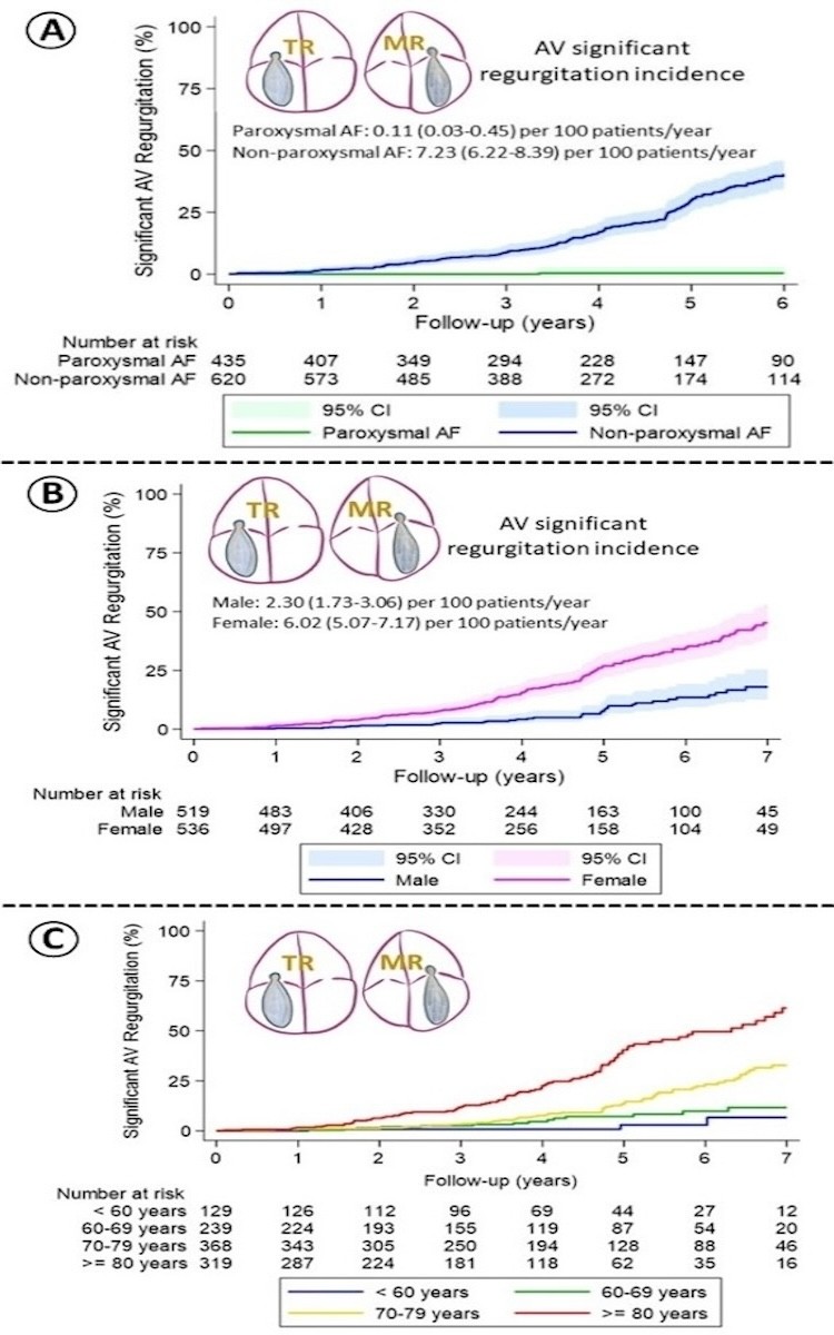 Significant mitral and tricuspid regurgitation (MR/TR) in patients with and without paroxysmal vs. non-paroxysmal atrial fibrillation (AF) [panel A], by sex [panel B] and by age [panel C].